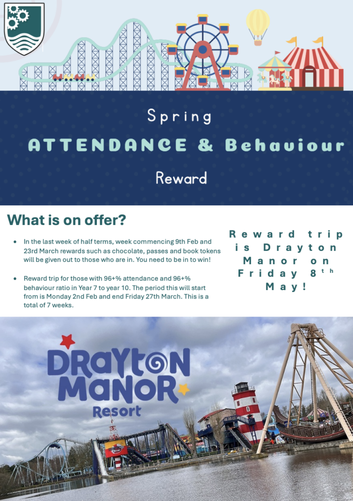It is time to share our Spring incentive for Attendance and Behaviour. All pupils in Year 7 to Year 10 have the opportunity to go to Drayton Manor on Friday 8th May. To get onto this trip pupils will require to have 96+% attendance and behaviour ratio. This will run between Monday 2nd February until Friday 27th March; attendance and behaviour will be measured over these weeks. Along with this at the end of each half term we will be celebrating those pupils who are in each day with rewards from chocolates to passes.