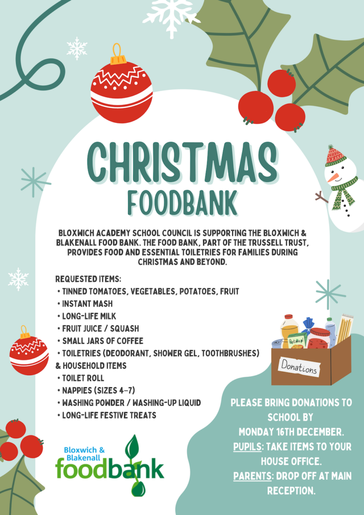 Bloxwich Academy School Council is supporting the Bloxwich & Blakenall Food Bank this festive season.